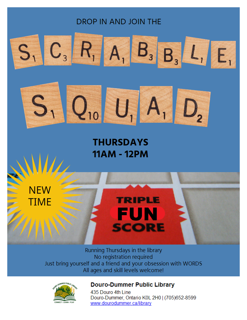 Drop in every Thursday and join the Scrabble Squad!  Play a game with other Scrabble fans, no registration required.
